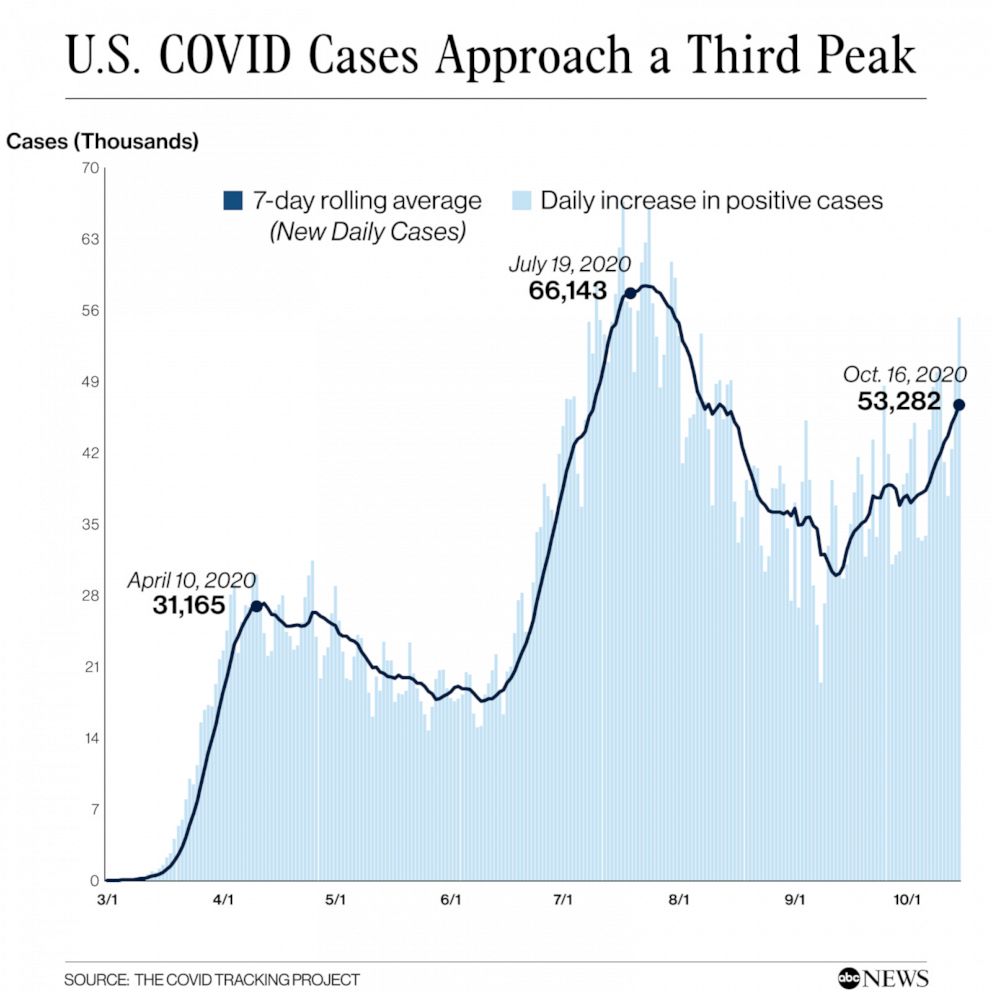 据美国广播公司(ABC)17日报道,随着美国中西部、东北部等地的确诊病例数持续攀升,美国新冠肺炎确诊病例正走向第三个高峰,或将第三次打破每日新增确诊病例数纪录。