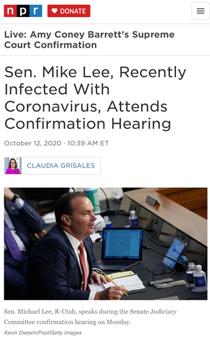 △美国国家公共广播电台报道,虽然参议员麦克·李近期确诊新冠,但依旧出席了大法官提名确认听证会,并且发言时不戴口罩