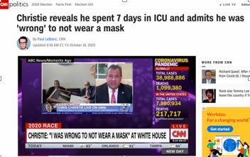 △CNN报道,克里斯蒂公开透露自己在ICU挣扎7天,并承认“不戴口罩是错误的”
