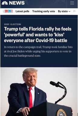 与之形成鲜明对比的是美国总统特朗普本人。在医院接受救治仅三天后,特朗普便“火速”出院,并表示感染新冠病毒是“上帝给予的一份礼物”。他甚至在12日的佛罗里达竞选集会上称,“从未感觉如此强大”,以至于“想给每人一个大大的吻”。