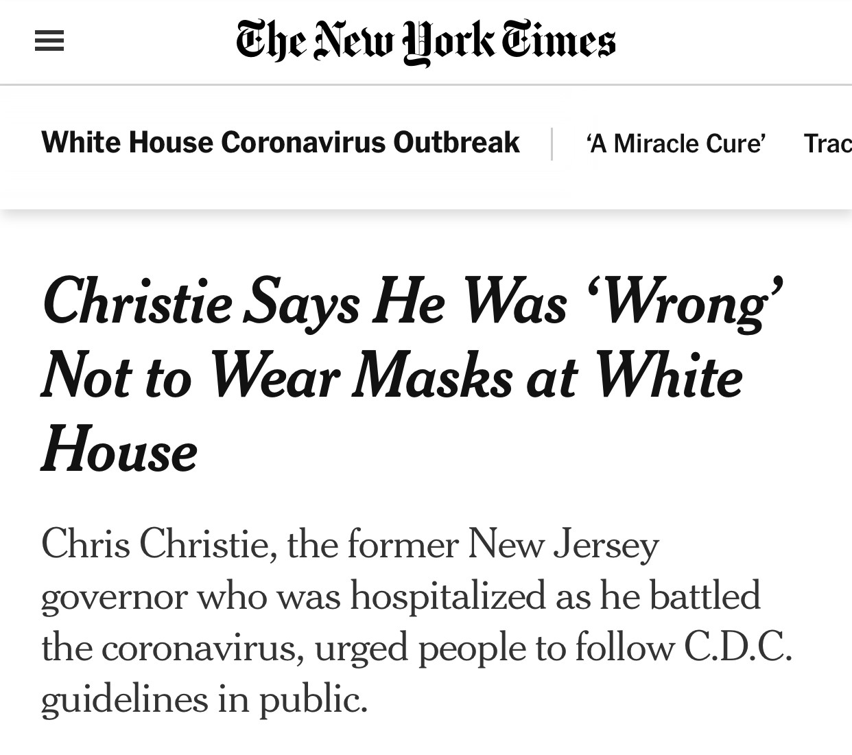 △《纽约时报》报道,克里斯蒂表示自己“错了”,不该不戴口罩
