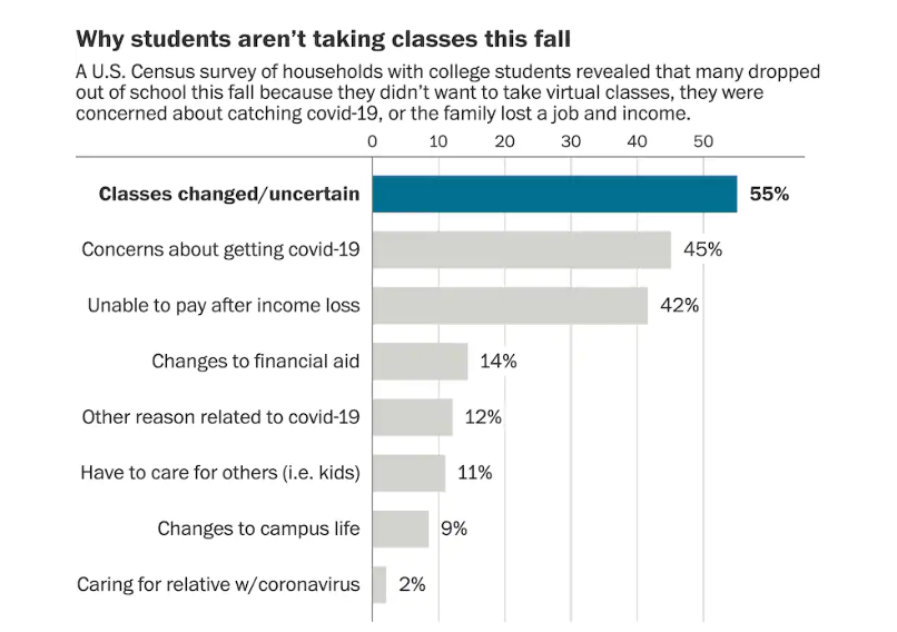 美国人口普查局数据显示,今年秋季因为经济原因辍学的学生占42%。
