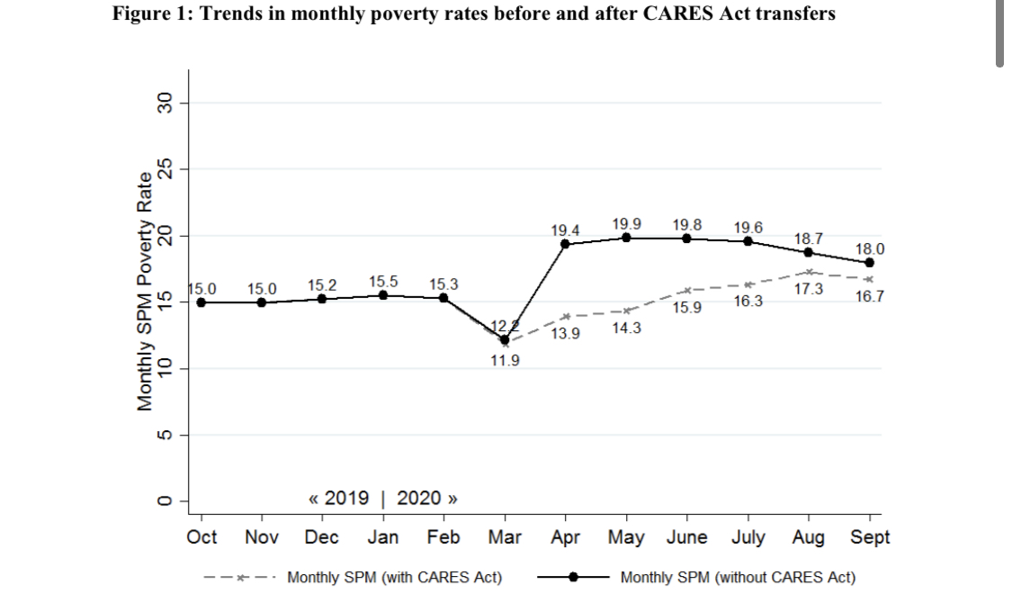 △基于家庭月收入的贫困率月度变化趋势图,虚线将联邦政府援助法案发放的救济金算入收入 (图片来源:哥伦比亚大学研究报告)