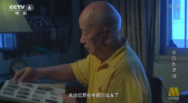 周文江抚摸着故去战友的照片,回忆往事(图源纪录片《冰血长津湖》)