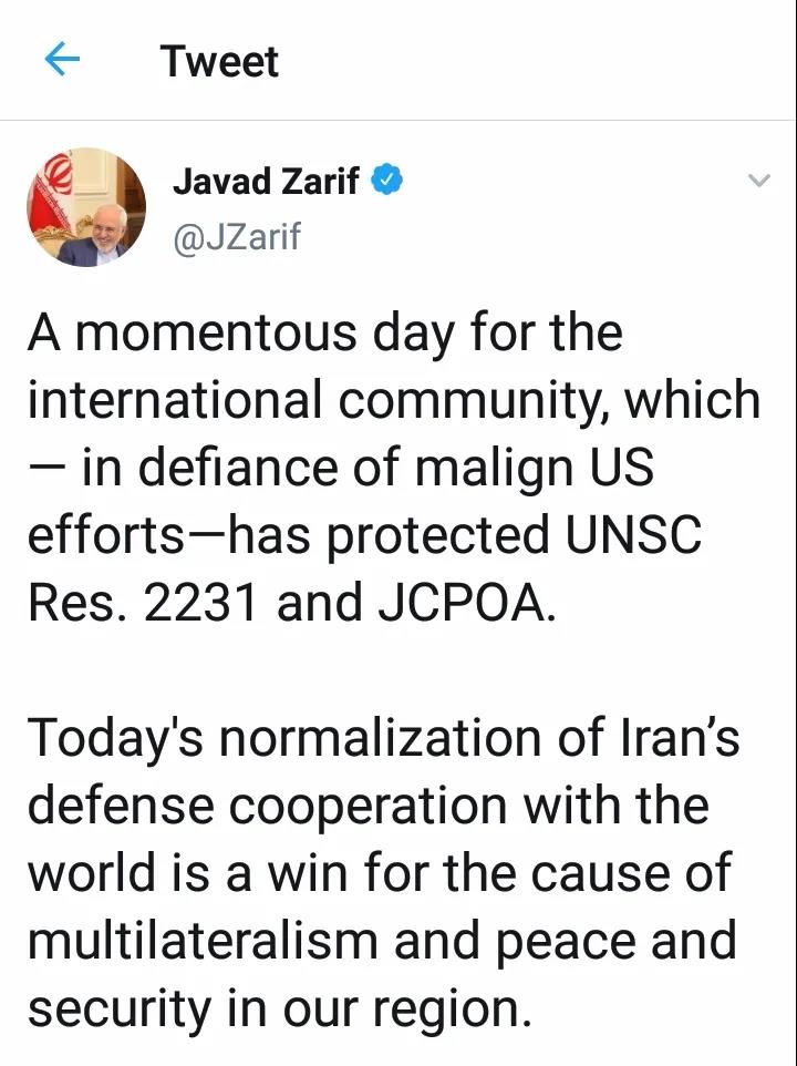 伊朗外交部长扎里夫10月18日在社交媒体表示,解除联合国对伊武器禁运标志着“伊朗与全球防务合作的正常化”,这也是多边主义以及地区和平与安全的胜利。