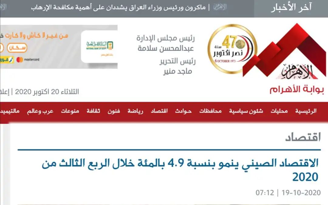 埃及《金字塔报》报道称,今年一季度经济遭遇下滑后,中国经济连续两个季度正增长,成为全球经济增长的主要引擎。中国采取严格措施控制疫情蔓延,并加快复工复产,向世界各地出口防疫物资和电子产品等疫情期间急需物品。文章关注到,本月底中国共产党即将召开十九届五中全会,预计中国将研究制定“十四五”规划,加快形成以国内大循环为主体、国内国际双循环相互促进的新发展格局。