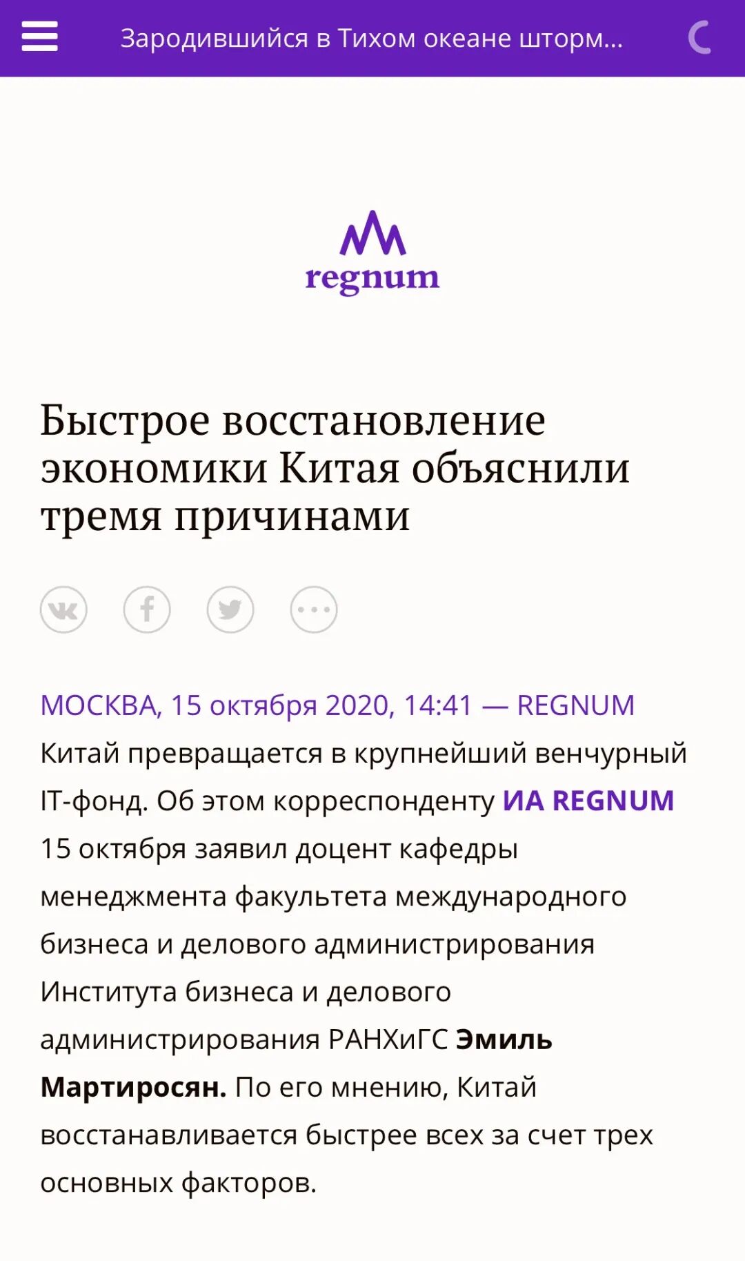 俄罗斯列格努姆通讯社的报道《三点原因解释中国经济快速恢复》