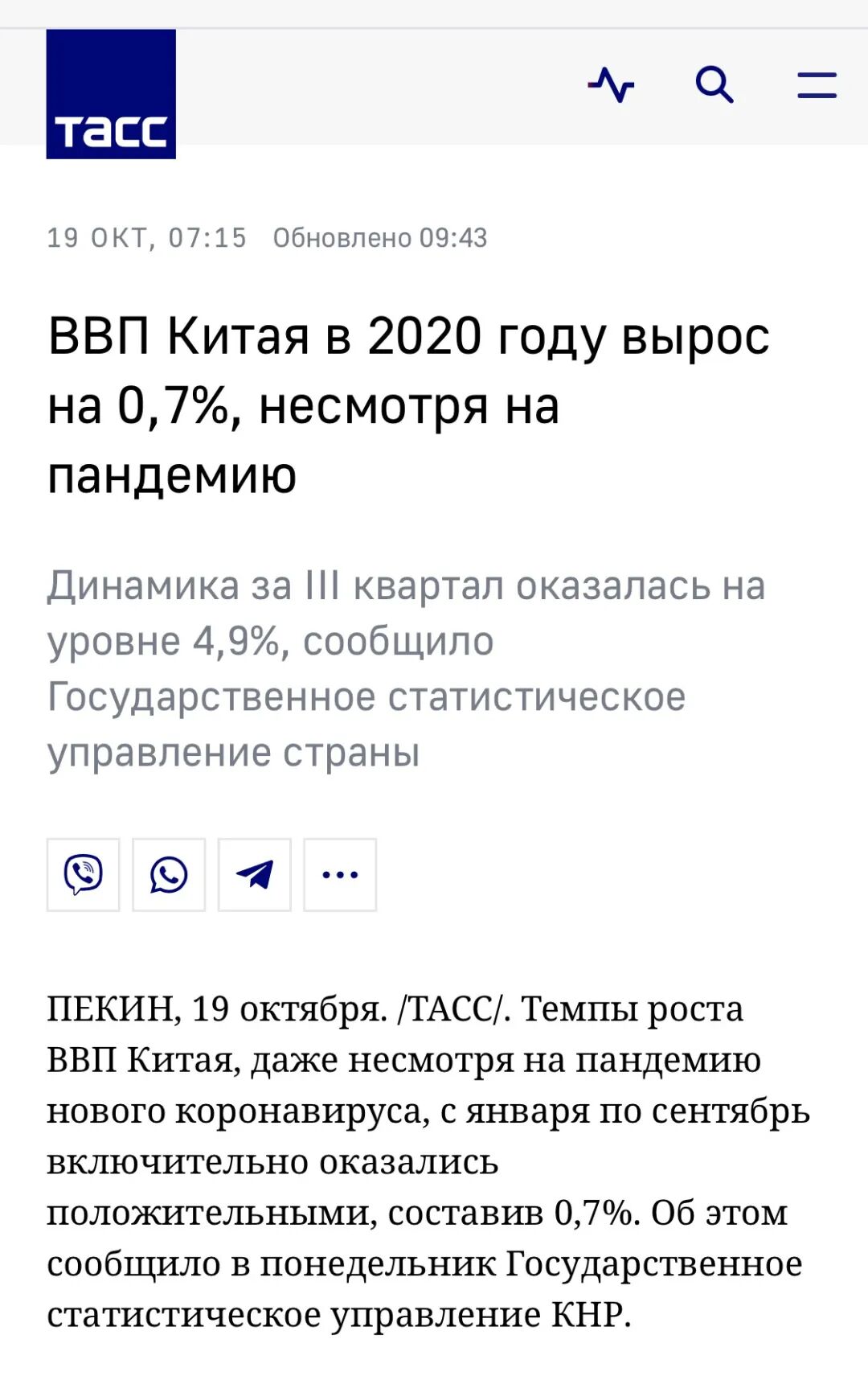 俄塔斯社在第一时间报道指出,尽管受到新冠肺炎疫情影响,今年前9个月中国国内生产总值仍实现正增长,增速为0.7%。随着中国经济逐步摆脱疫情负面影响并不断复苏,第三季度经济增速更令人鼓舞,达4.9%。