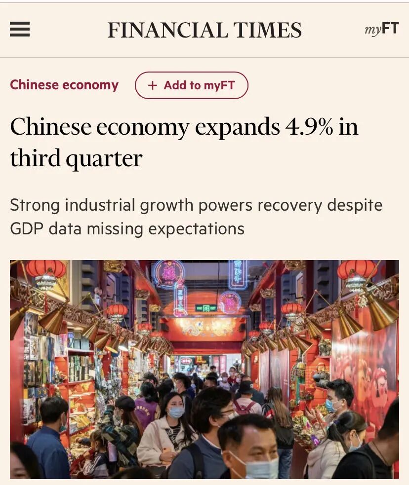 文章分析认为,虽然今年第三季度中国经济4.9%的增速略低于此前专家预期的5.5%,但较第二季度3.2%的增长提速明显,与第一季度相比,形势得到了彻底扭转。