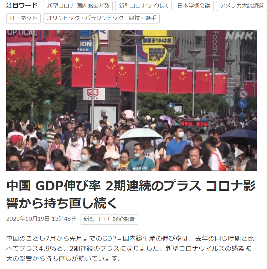 日本NHK电视台在午间新闻报道中也指出,中国经济实现了两个季度连续回升,强调中国政府在控制住疫情后较早地推动了经济活动重开,并通过积极财政政策促进基建投资。特别是疫情正继续在世界各地蔓延情况下,居家办公所需笔记本电脑等商品出口形势见好,口罩、医疗器械等出口大幅增加推动了GDP回升。该报道指出,中国在世界主要国家和地区中最先实现了经济恢复,但GDP增速尚未恢复到疫情前水平,今后促进个人消费将是重要课题。