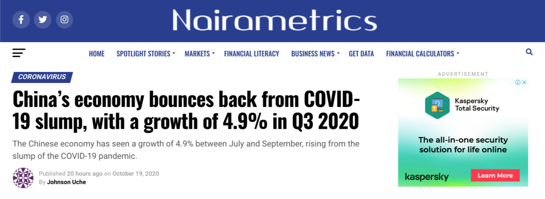 尼日利亚财经媒体Nairametrics报道称,中国第三季度国内生产总值同比增长4.9%,经济恢复势头进一步巩固,继续引领全球经济复苏。文章关注到,中国9月份进出口额、“双节黄金周”旅游收入、海南离岛免税商品销售额等数据显示,随着各行业复工复产,中国经济增长势头愈发强劲。文章强调,中国保持了就业形势总体稳定,这为中国创造了更多的消费。