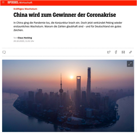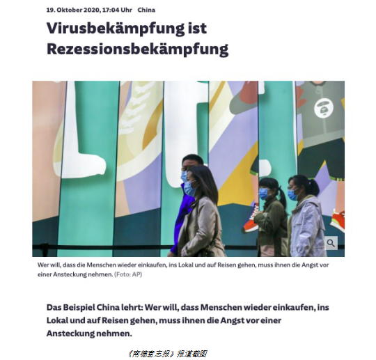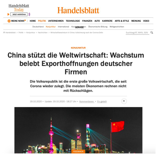 德国《商报》当地时间19日晚在其网页上发布了题为《中国支撑世界经济》的文章。报道指出,中国国内生产总值继今年一季度创纪录地同比下降6.8%之后,二季度实现逆转、增长3.2%,成为新冠肺炎疫情暴发以来首个实现增长的世界主要经济体,而第三季度4.9%的增长率则继续保持住了这一稳定恢复的态势。文章表示,中国经济增长重振了德国企业因新冠危机而受挫的出口希望,包括汽车、机械制造、物流在内的多个行业均报告了增长喜讯。