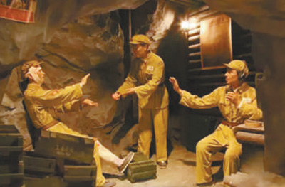 上甘岭特功八连荣誉室用实景蜡像还原坑道内战士传递苹果的场景。夏 澍摄