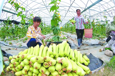 绿油油的蔬菜、累累的瓜果……在江西省于都县梓山潭头富硒蔬菜产业园147号蔬菜大棚里,潭头村村民曾风秀、易伟萍正在采摘新鲜的丝瓜准备上市。