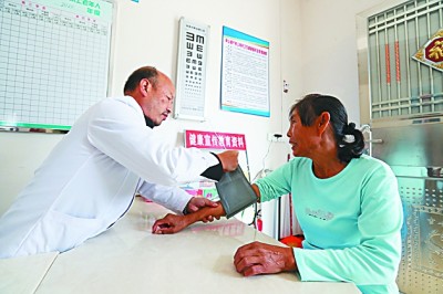 潭头村卫生健康服务室医生刘海生给村民量血压。
