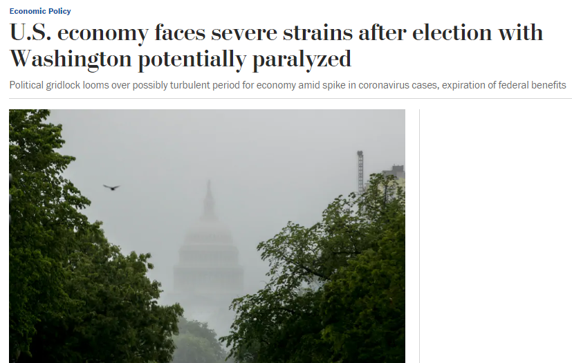 美国大选投票终于结束了。虽然选举结果尚未公布,但无论谁当选新一任总统,因新冠肺炎疫情深陷泥沼的美国经济都没有多少时间再等了。《华盛顿邮报》当地时间3日发表题为《大选后或现政治瘫痪,美国经济面临严峻压力》的文章,对美国经济的复苏前景表达了担忧。