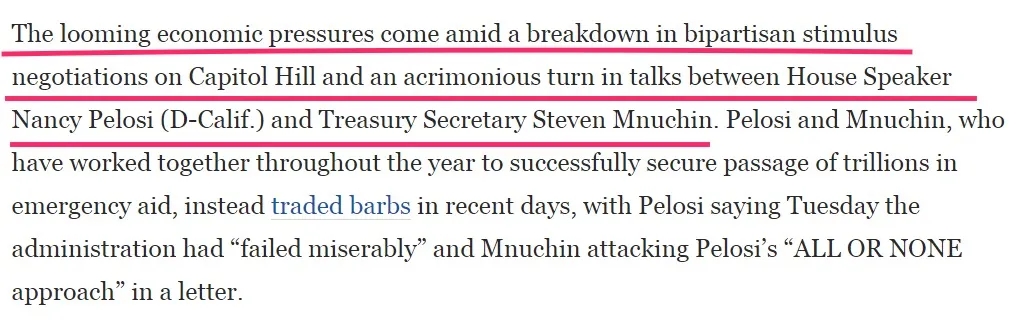 △《华盛顿邮报》:在国会两党谈判破裂、众议院议长佩洛西和财政部长姆努钦之间再起尖锐冲突之际,迫在眉睫的经济压力出现了。