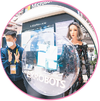 第三届进博会技术装备展区内各式先进机器设备随处可见,高度智能化的机器应用场景让人大开眼界。图为微软展台展示的EX仿生机器人。翟慧勇摄(人民视觉)