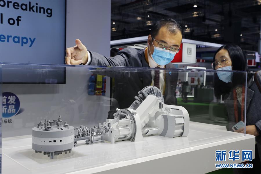 11月5日,在医疗器械及医药保健展区瓦里安医疗展台,工作人员介绍在本届进博会上“亚太首发”的ProBeam360紧凑型单室质子治疗系统。新华社记者 刘颖 摄