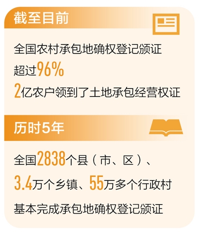 开展农村承包地确权登记颁证工作,确定了对土地承包经营权的物权保护,让农民吃上长效“定心丸”,巩固和完善了农村基本经营制度。按照党中央、国务院部署,我国从2014年开始启动整省试点并逐步全面推开,历时5年在全国2838个县(市、区)、3.4万个乡镇、55万多个行政村基本完成承包地确权登记颁证工作。