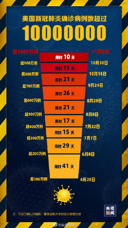 此前,从700万例到800万例,用了21天,从800万例到900万例,用了14天。而现在,从900万上升至1000万,美国仅仅用了10天时间。