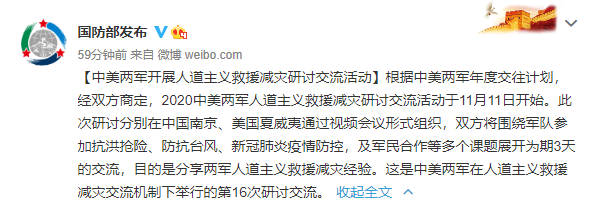 根据中美两军年度交往计划,经双方商定,2020中美两军人道主义救援减灾研讨交流活动于11月11日开始。此次研讨分别在中国南京、美国夏威夷通过视频会议形式组织,双方将围绕军队参加抗洪抢险、防抗台风、新冠肺炎疫情防控,及军民合作等多个课题展开为期3天的交流,目的是分享两军人道主义救援减灾经验。这是中美两军在人道主义救援减灾交流机制下举行的第16次研讨交流。