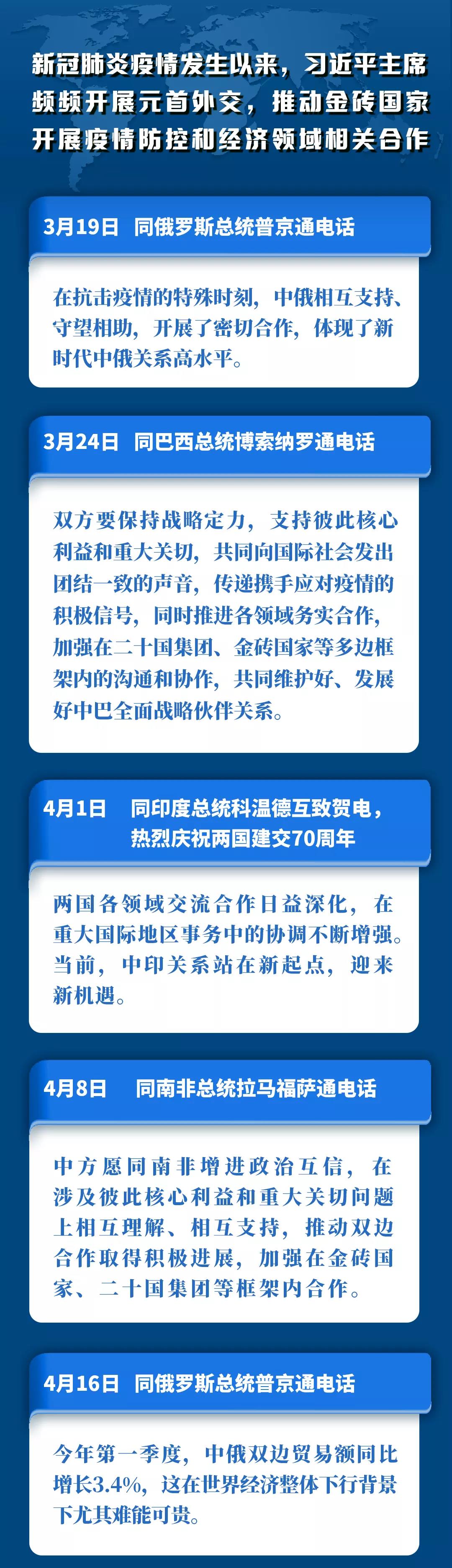 ——4月28日,金砖国家应对新冠肺炎疫情特别外长视频会议呼吁携手抗疫,强调密切疫情信息分享和经验交流,开展药物和疫苗研发合作。