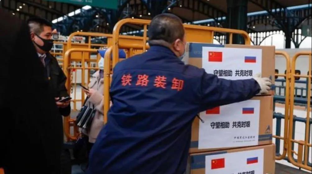 用中文和俄语写着“病毒必将被击败,胜利属于我们!”标语的医疗物资多次从中国运往俄罗斯。