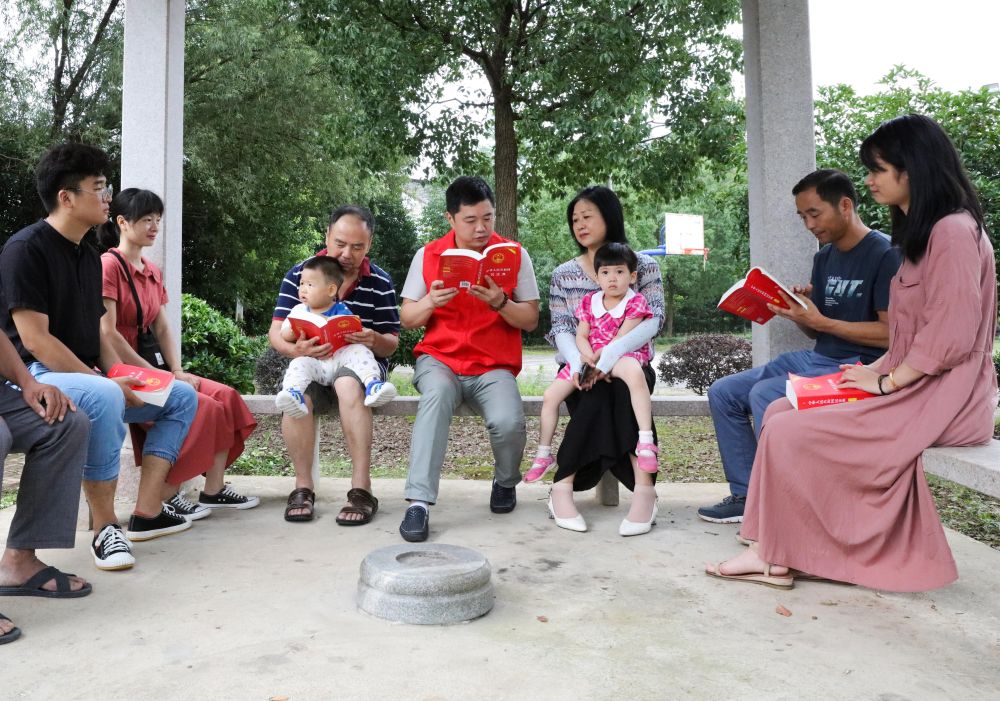 2020年7月4日,在浙江省长兴县小浦镇中山村的法治长廊里,党员志愿者为村民宣讲民法典。新华社记者 徐昱 摄