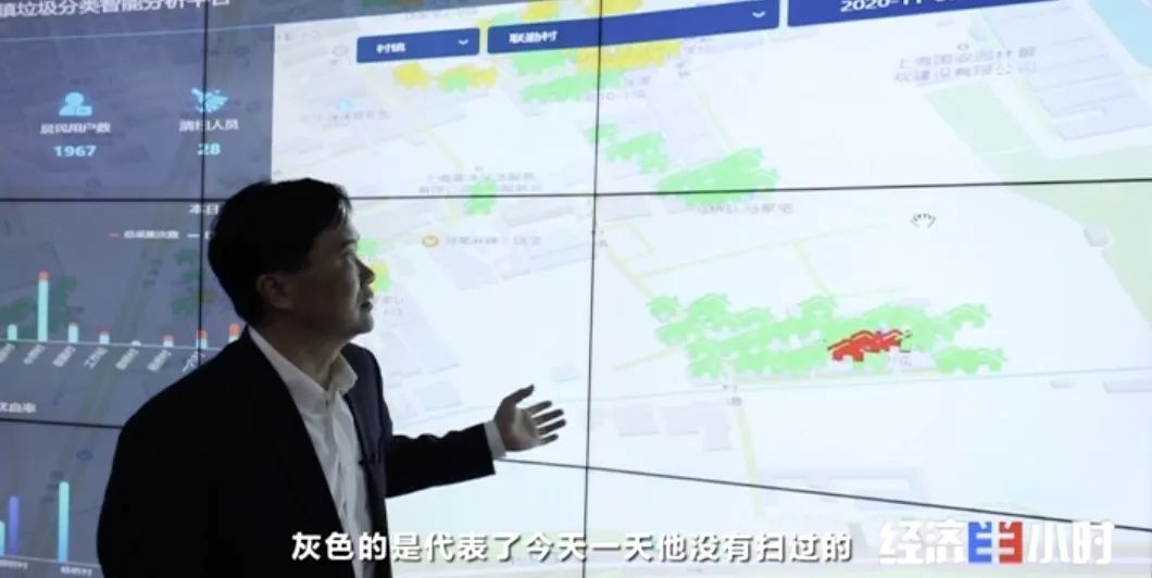 假如保洁员对某户人家的垃圾分类给出差评后,对应的图标就会变红。一块大屏,连接了北蔡镇2000多个商户、1900多个农户的二维码,垃圾分类情况一目了然,一旦出现红标,村里联动的运管系统就会有提示,并在6小时内进行整改。