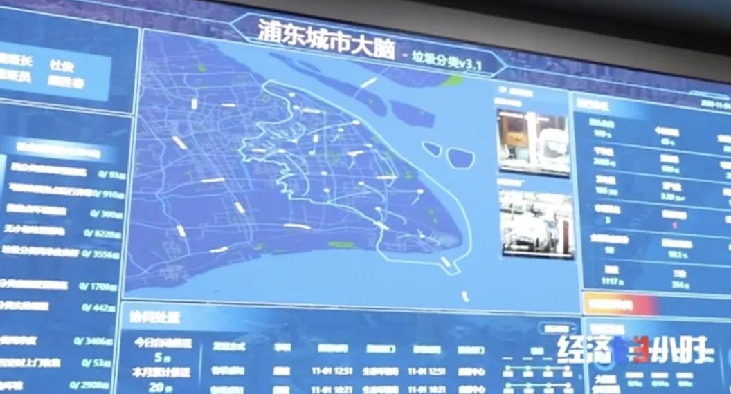 而此时,在上海市浦东新区北蔡镇的城市运行综合管理中心,副镇长钱戴平正和同事,站在大屏幕前,查看当天镇上的垃圾分类情况。
