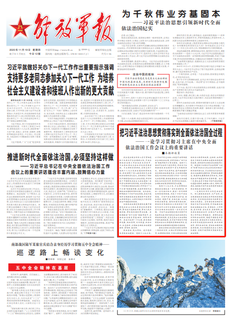 在全党全国全军深入学习贯彻党的十九届五中全会精神之际,中央全面依法治国工作会议在北京召开。习主席出席这次会议并发表重要讲话。习主席的重要讲话,全面总结了党的十八大以来法治建设取得的成就,深刻阐明了深入推进新时代全面依法治国的重大意义,系统阐述了新时代中国特色社会主义法治思想,科学回答了中国特色社会主义法治建设一系列重大理论和实践问题,对当前和今后一个时期全面依法治国工作作出了“11个方面”的战略部署,是指导新时代全面依法治国的纲领性文献。这次会议,鲜明提出了习近平法治思想,在我们党领导全面推进依法治国进程中具有重大里程碑意义,必将引领我们不断开创法治中国建设新局面。
