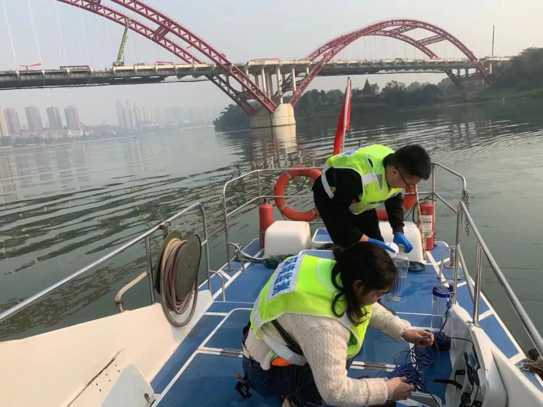 碧波划过,白浪叠起,合川生态环境监测站站长钟小容和同事们正在船上进行水样监测。