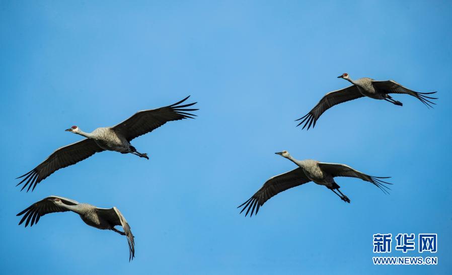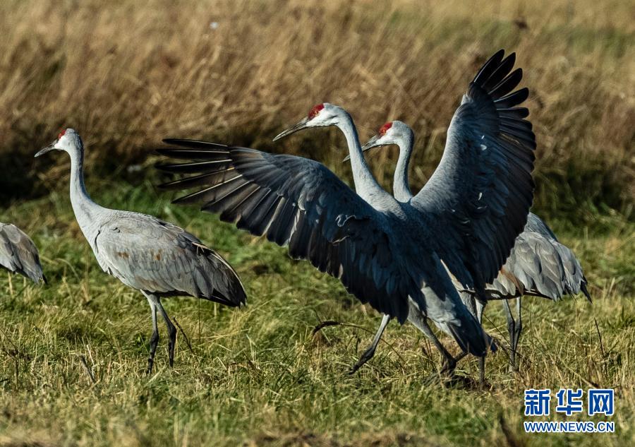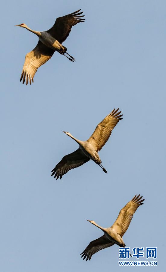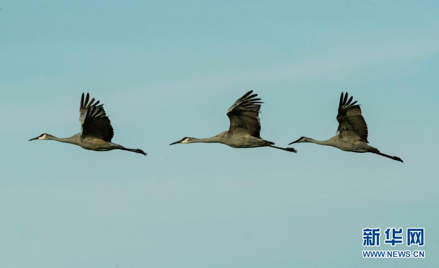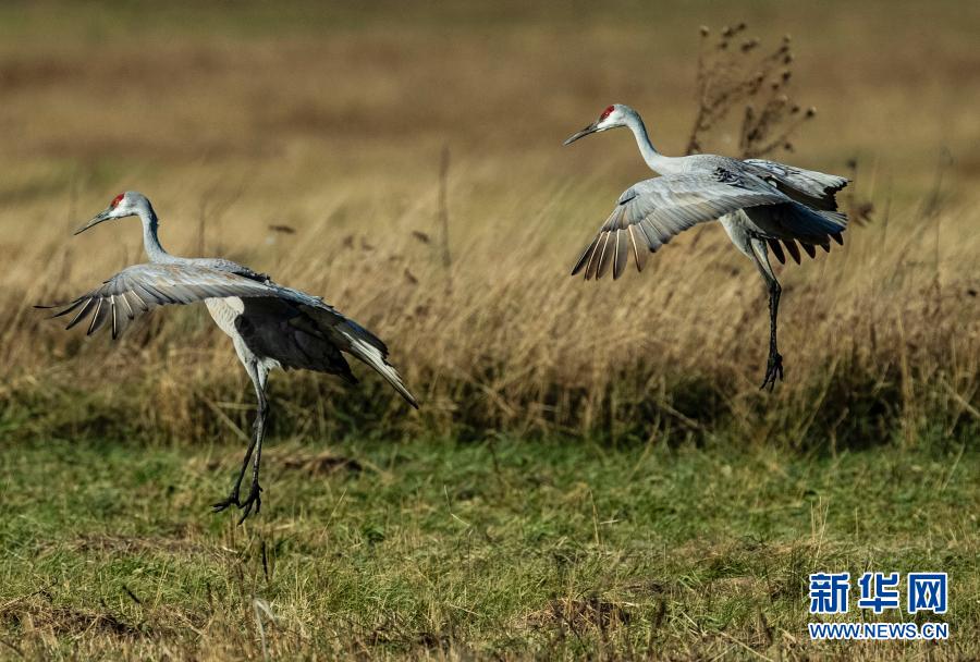 每年10月至12月初,沙丘鹤从北部繁殖地向南部越冬地迁徙时,会在美国印第安纳州梅达里维尔的贾斯珀-普拉斯基野生动物保护区栖息,吸引众多游客前来观赏,成为冬季里的一道风景。新华社发(乔尔·莱纳摄)