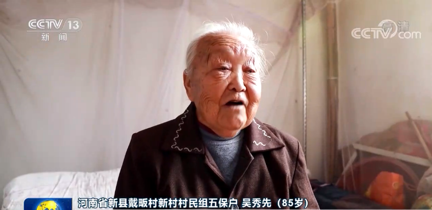河南省新县戴畈村新村村民组五保户 吴秀先(85岁):三天两头的来看我,给我抻床,给我扫地,还来照顾我,党的政策好啊。