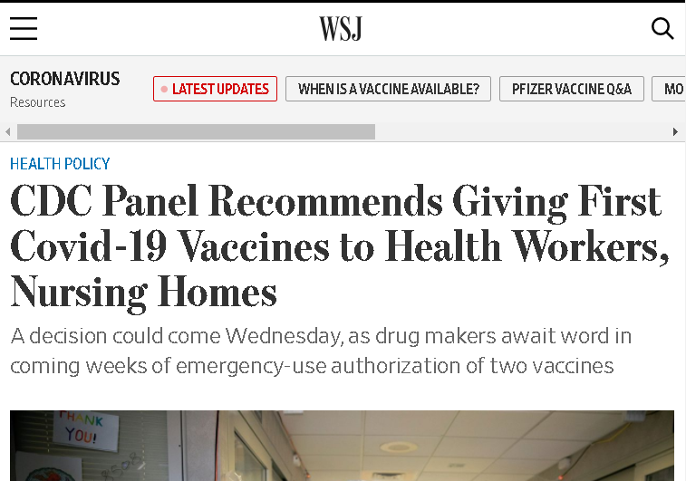 △《华尔街日报》报道,美国CDC专家小组建议给医护人员和养老院接种首批新冠疫苗