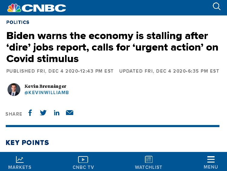 正如美国当选总统拜登所言,最新出炉的“严峻”的就业报告,显示经济复苏停滞不前,他警告说,除非美国国会立即通过新一轮纾困法案,否则即将到来的“黑暗的冬天”,将加剧这种痛苦。