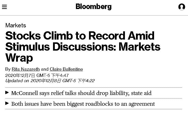 △彭博社报道,在有关新一轮刺激措施的讨论中,美国股市攀升至历史新高
