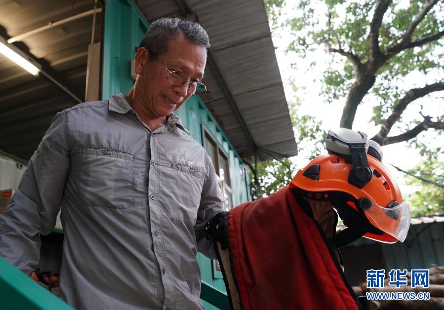 长期在户外工作,李国文的皮肤黝黑,但饱满的精神状态丝毫没有显示出他已经63岁了。他有一套树艺师工作装备:安全帽、护目镜、攀树绳、电油链锯等。
