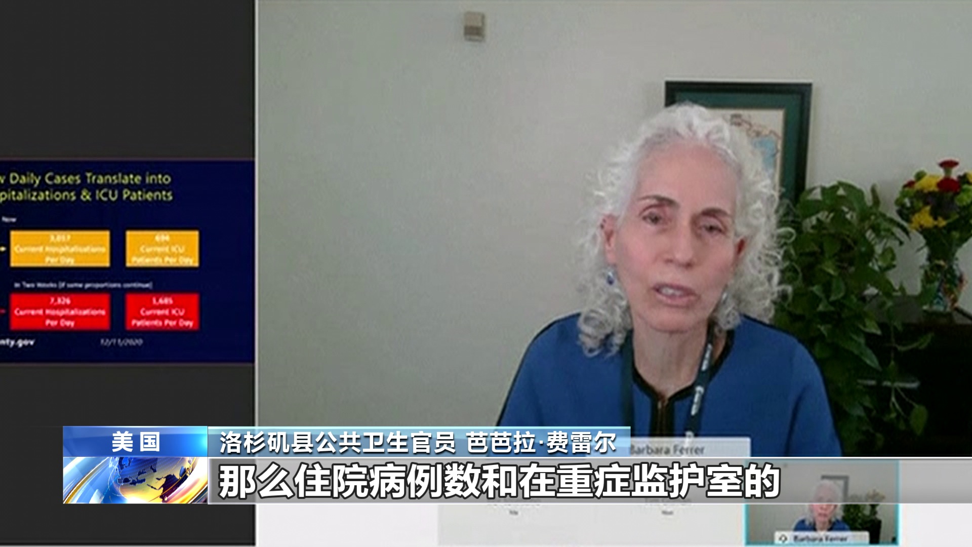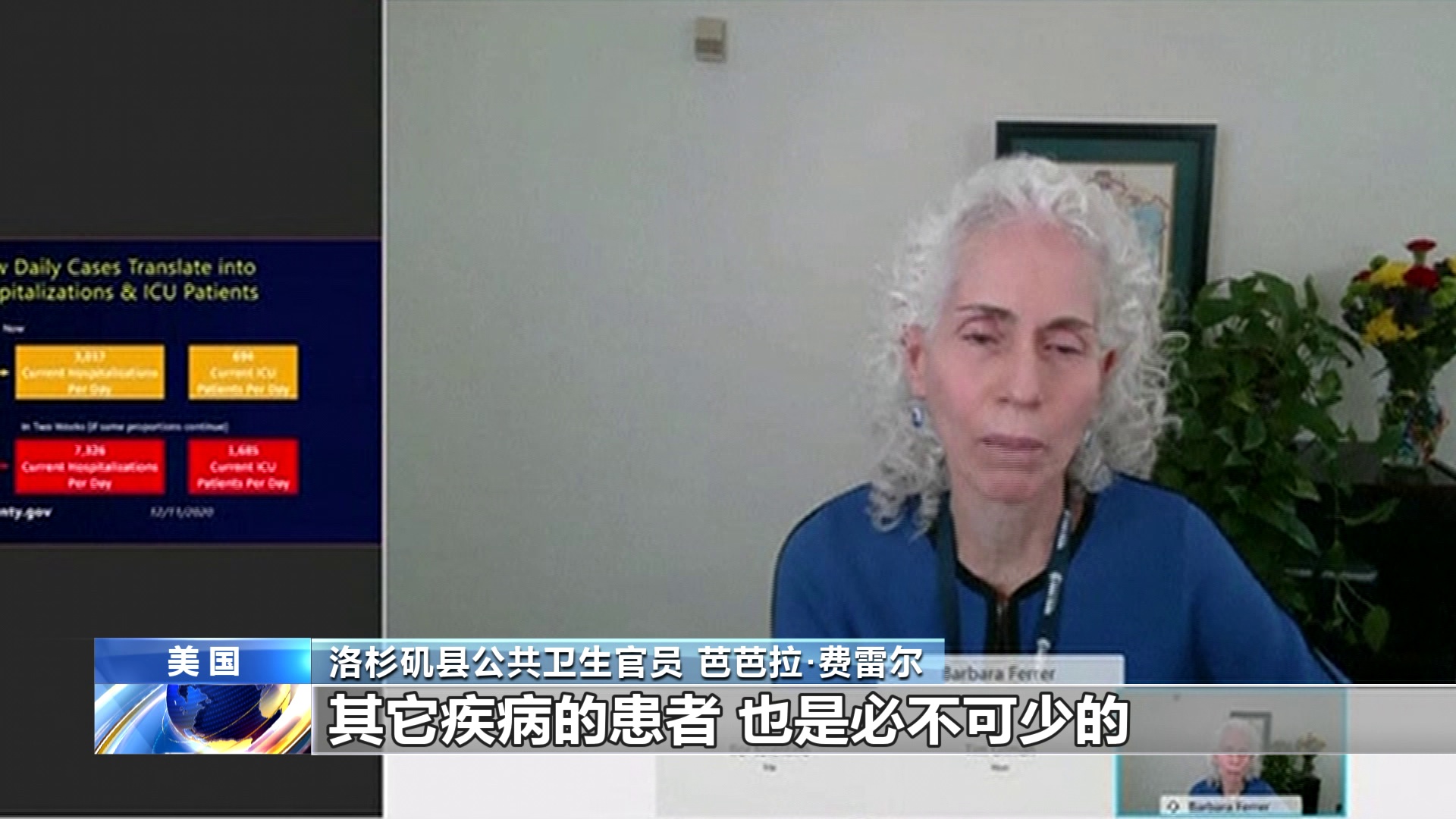 洛杉矶县公共卫生官员 芭芭拉·费雷尔:本周我们每天平均新增病例大约10200例,如果住院病例数继续按当前比例增加,两周内我们可能看到超过7300名患者因新冠肺炎住院。其中1600多名可能需要在重症监护室治疗,这让我们所有人担忧,因为我们县的医院只有约2100张重症监护室的成人床位,而且这许多床位对于包括受外伤、接受心脏手术和癌症治疗等其它疾病的患者,也是必不可少的。