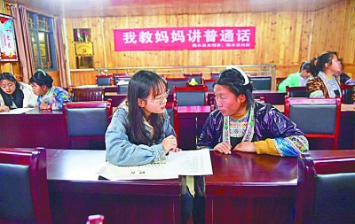 大学生潘木枝(左)教妈妈潘春迷讲普通话。