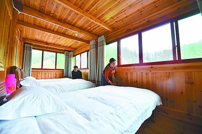 乌英苗寨村民吴新仁、何玉青夫妇在打扫整理刚刚开业的民宿。
