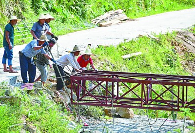 乌英苗寨村民在建铁架桥。