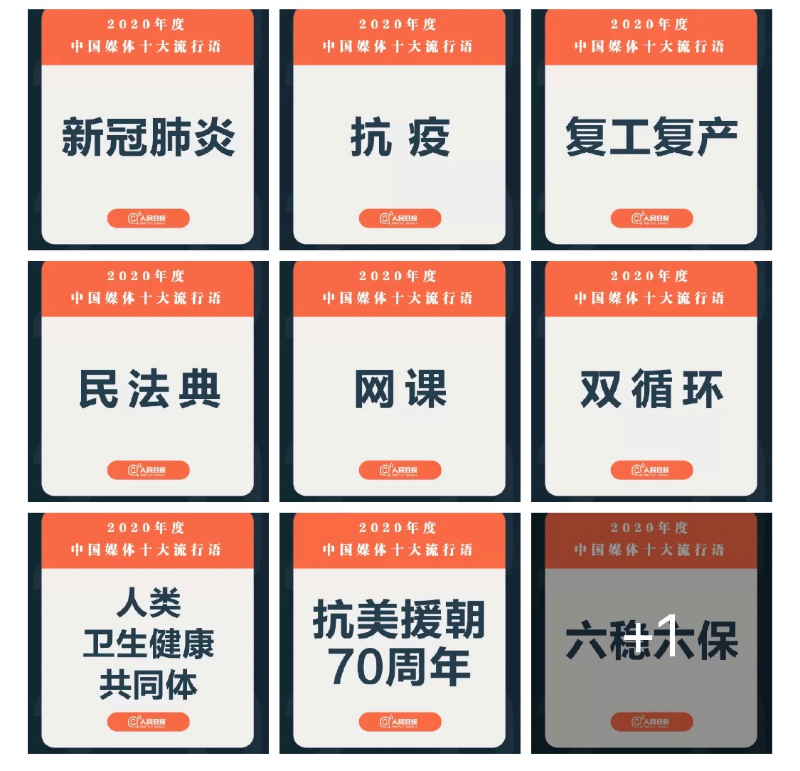近日,“2020年度中国媒体十大流行语”如期出炉,依次为:新冠肺炎、抗疫、复工复产、民法典、网课、双循环、人类卫生健康共同体、抗美援朝70周年、六稳六保、嫦娥五号。令人瞩目的是,十大流行语里,与新冠肺炎疫情相关的词汇多达7个。这既是对全年重点事件的忠实盘点,也从一个侧面记录了中国上下抗击疫情的非凡历程。