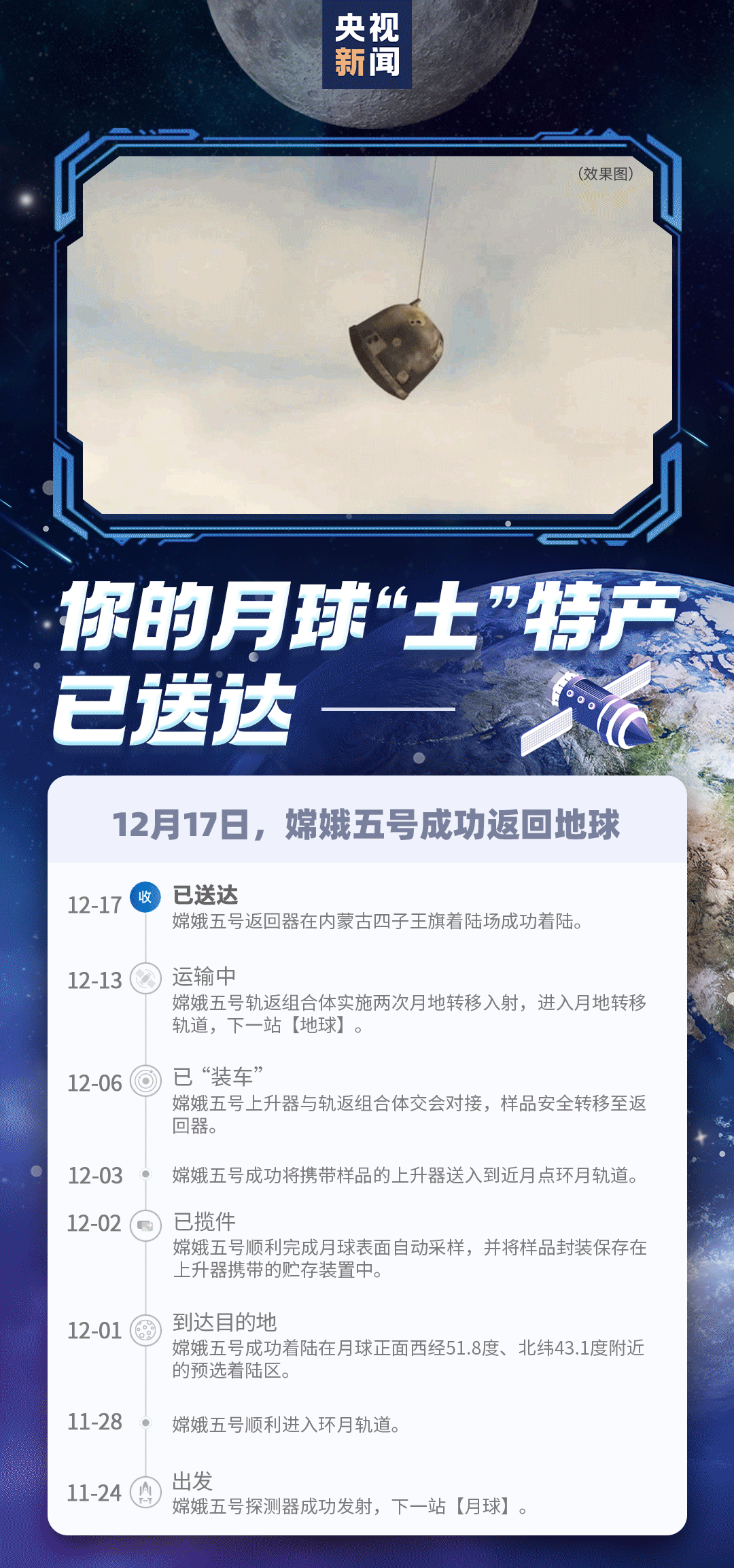 12月3日,上升器点火起飞、精准入轨,于6日完成与轨道器和返回器组合体之间的交会对接及样品转移,此后按计划分离并受控落月。