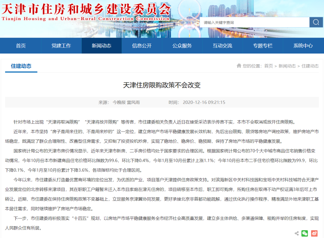 针对市场上出现“天津将取消限购”“天津将放开限购”等传言,天津市住建委相关负责人近日在接受采访表示传言不实,该市不会取消或放开住房限购。