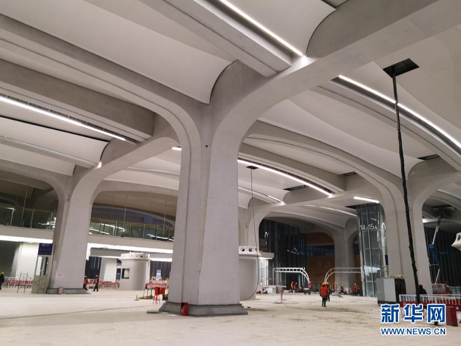 这是河北雄安站首层候车大厅清水混凝土“开花柱”(手机照片,12月16日摄) 。新华社记者 曹国厂 摄
