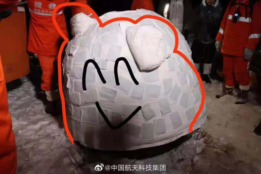 被地面搜索队找到后,队员们为“嫦五”返回舱全身上下贴满了暖宝宝,使它多出了两个萌萌的“耳朵”。