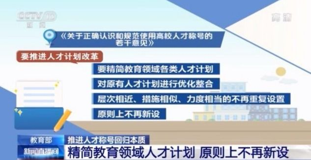《意见》提出要推进人才计划改革。要精简教育领域各类人才计划,对原有人才计划进行优化整合,层次相近、措施相似、力度相当的不再重复设置,原则上不再新设。在相同层次人才计划实施中,高校要避免重复推荐人选,同一人才在计划支持期内只能获得一项。