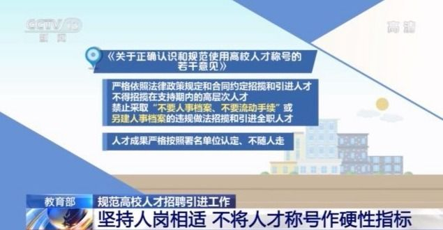 《意见》要求高校精准提出人才招聘和引进岗位需求。要坚持人岗相适原则延揽人才,不将人才称号作为硬性指标,不针对人才称号获得者发布“明码标价”的招聘广告。要统筹用好国内外人才资源,不将国(境)外学习或工作经历作为人才招聘引进的限制性条件。
